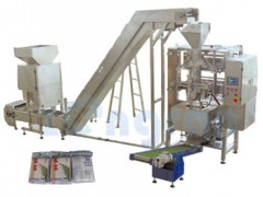 此機組包含了VFS7300全自動立式包裝機,CJS 2000全自動電子稱量機,DT5 Z型斗式提升機,DT5 傾斜式斗式提升機,ZB2000(一體式)真空包裝機組以及成品輸送機。該機組實現了自動送料,計量,充填,抽真空,封口,整形,打印,沖孔,計數,成品輸送與一體。機器的長期正常穩定運行。該機組廣泛應用于大米等谷物類產品的真空包裝,袋型美觀,密封效果好,密封時間長。