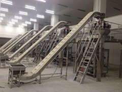 該機組為冷凍類產品專用包裝機組,提升設備采用我公司生產的大傾角提升機,該提升機有輸送簡單清理方便的優點,由提升機把物料提升到稱量機的料倉, C