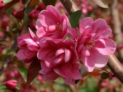 紅寶石海棠的花期為4月中下旬,花為傘形總狀花序,花蕾粉紅色,花瓣呈粉紅色至玫瑰紅色,多為5片以上,半重瓣或者重瓣,花瓣較小,初開鄒縮,直徑3厘米。果實亮紅色,直徑約0.75厘米,果熟期為8月,宿存。