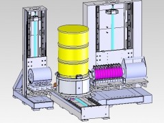 根據廢物桶斷層掃描檢測儀要求,機械系統主要由以下部分組成:廢物桶水平平移臺、廢物桶旋轉臺、垂直升降臺(放射源裝置部分)和垂直升降臺(探測器及液氮罐部分)組成。機械系統的三視圖如圖1所示。