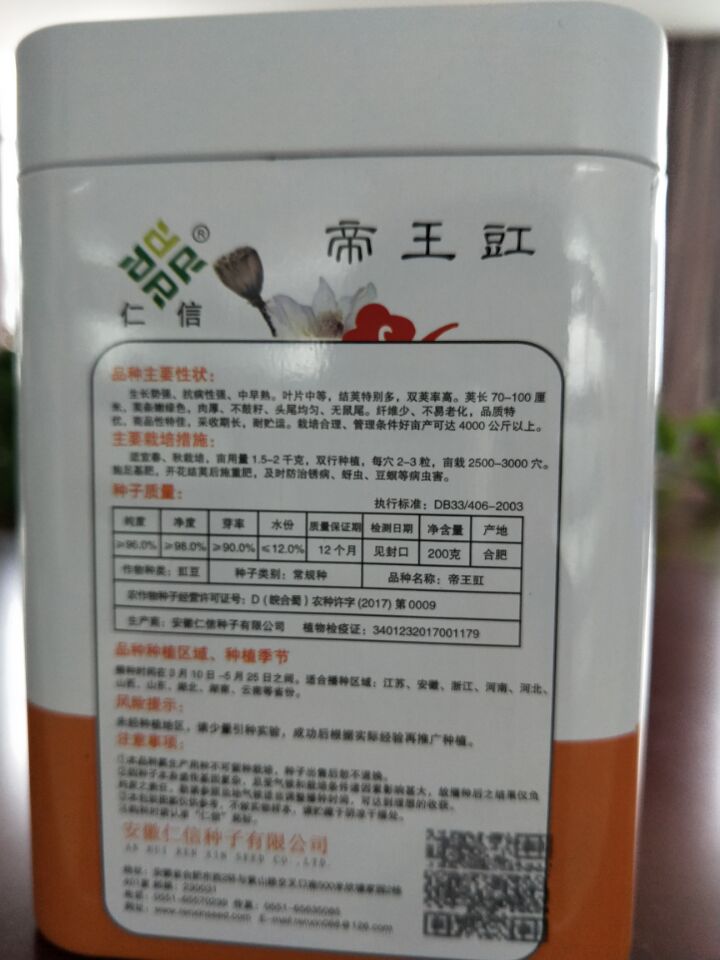 豇豆圖案以將長勢良好的豇豆圖案示于眾人,并且配以“中早熟,高產,特抗病,春夏秋均可播種,長可達1米”的字樣,清晰明確地表達了此款種子的生長習性。鐵盒的功能不僅僅在于保護種子的安全,更在于讓本品的屬性廣而告之,讓更多的受眾者了解這款產品的優良,進而促進購買。