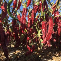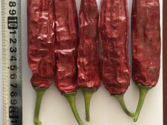加工型早熟雜交種,無限分枝類型。株高70厘米左右,株幅50~60厘米,第一花著生節位11節,結果集中,座果能力強,果實羊角形,果長20厘米左右,果實橫徑3.5厘米左右,干椒單果重8~9克,單株座果數30個左右,青果綠色,成熟果深紅色。維生素C含量137毫克/千克,辣椒素含量0.012%,色價370ASTA。感病毒病CMV,感病毒病TMV,抗疫病,中抗炭疽病,中抗細菌性斑點病,耐熱性強,抗倒伏能力強。第1生長周期畝產530.66千克,比對照蓓蕾一號增產18.36%;第2生長周期畝產548.75千克,比對照蓓蕾一號增產19.39%。干椒畝產800~820公斤。