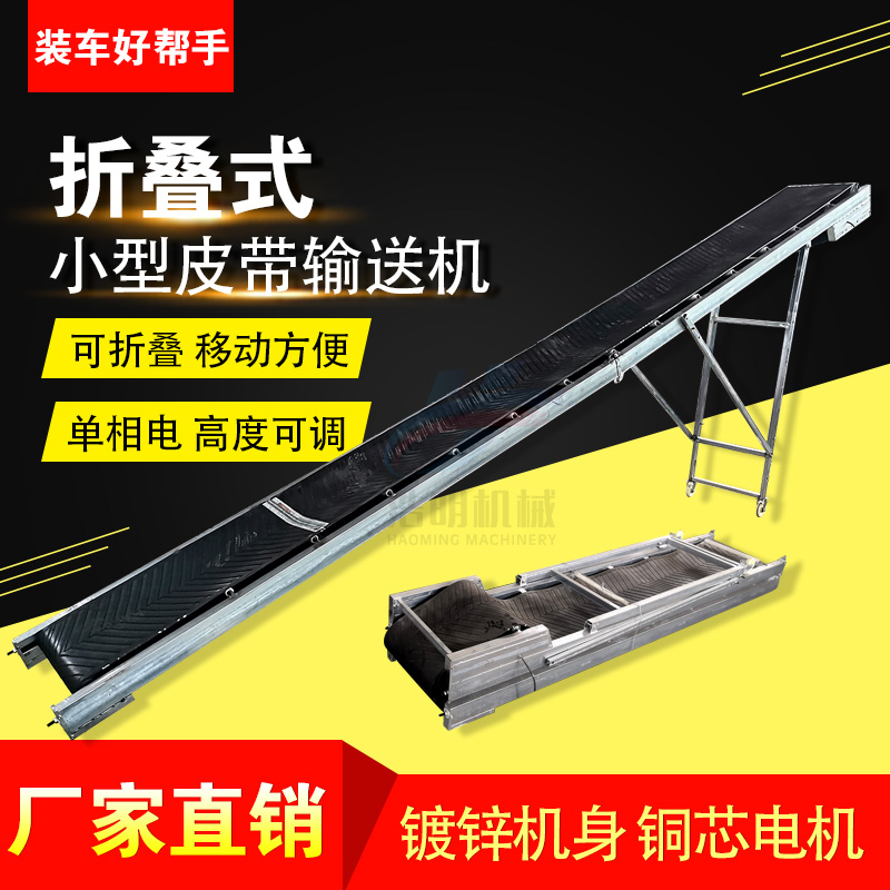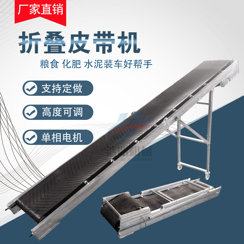 玉米裝車折疊式皮帶輸送機經過精心設計而成,具有重量輕變、移動方便,使用簡單,可以折疊,價格便宜等特點。皮帶上配有防滑帶,比普通輸送機輸送角度更大,更方便裝車使用。