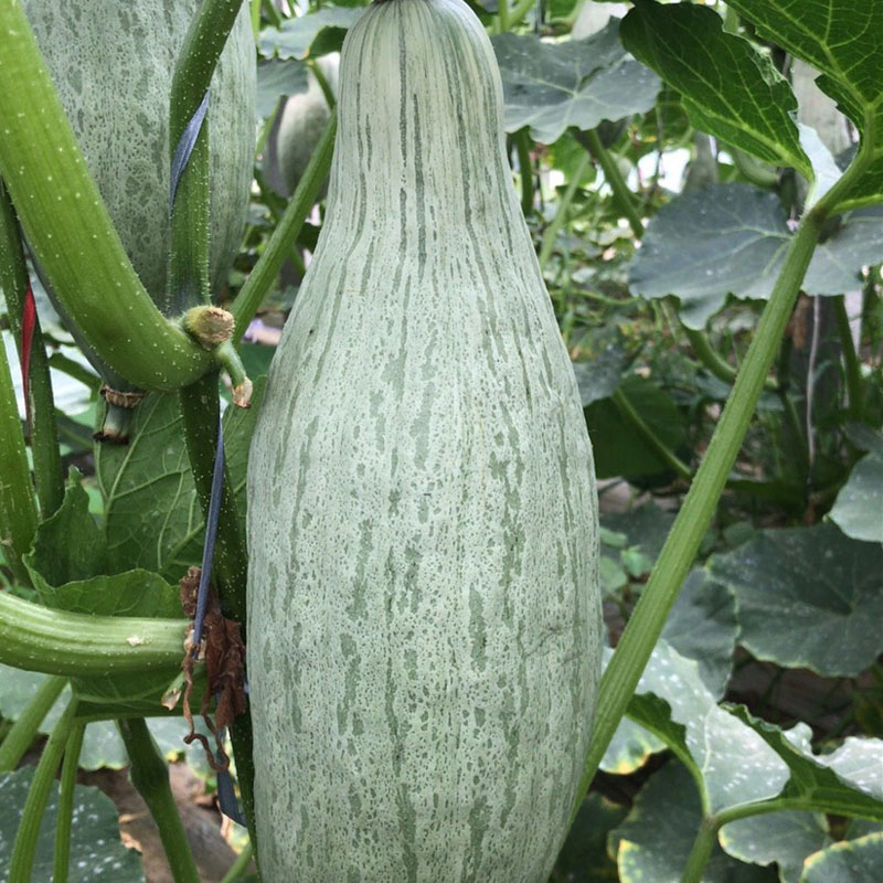 貴族南瓜果實紡錘形,青黑皮,瓜長25-35公分,中間橫莖10-15公分,單瓜重2-3公斤,單株座果2-3個,果實發育35天左右,果肉橘紅色,風味干面,香甜可口,汁少似板栗,果實著色一致性受光照、氮肥等因素影響較大,在座果期需嚴格整枝,以利于通風透光,后期氮肥不可過多,以免徒長,導致著色不良。