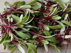 甜菜苗屬于葉用甜菜,莖桿紅色,葉片綠色,成熟期約為30天。適合容器內做芽菜栽培。與口感甜嫩,而栽培則同樣容易。采收時將它們葉片從根部以上5厘米處剪下。 性喜冷涼濕潤的氣候。但耐寒及耐熱力均較強。種子在4-5℃下能緩慢發芽,發芽適宜溫度18-25℃。低溫、長日照有促進花芽分化的作用。生長期需要充足的水分,但忌澇。適宜中性或弱堿性、質地疏松的土壤。耐肥,耐堿。可做芽苗菜栽培,并食用。